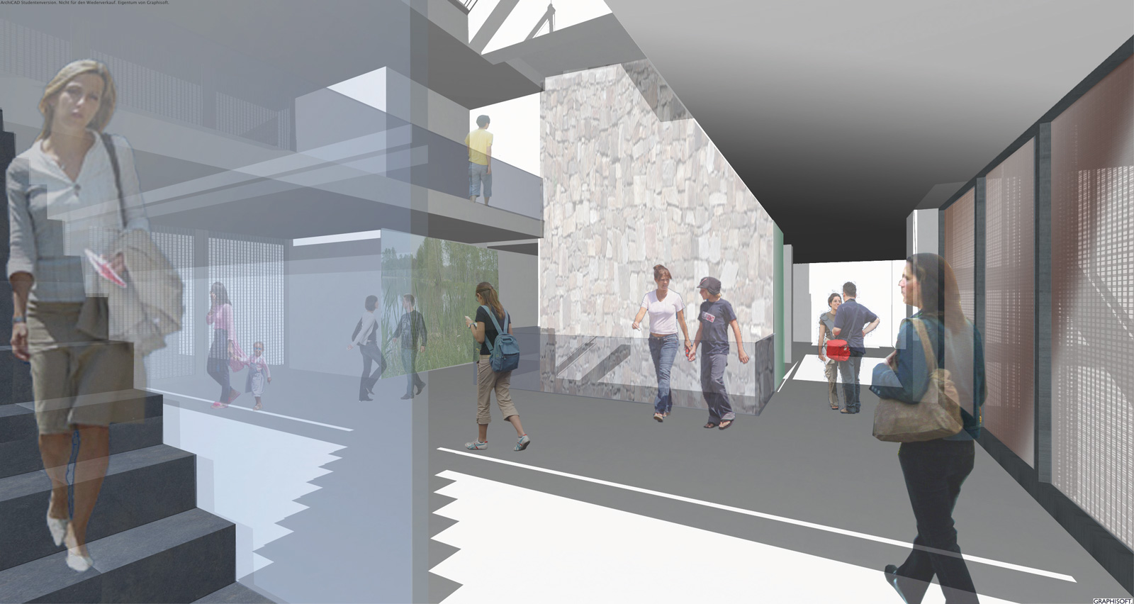Die übereinanderliegenden Museumsräume werden durch das Spannungsfeld zwischen dem alten Haus und dem neuen Zubau bestimmt. Über den Glasbau sind Blickbezüge durch alle Geschichtsepochen möglich. Der Rundgang führt in großen Schleifen durch das Haus.