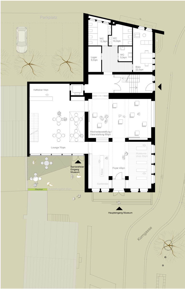 Der Hauptzugang zu den Museumsräumen befindet sich an gewohnter Stelle im Altbau; er wird durch einen barrierefreien Zugang über das Glashaus mit Café ergänzt. Der vorgelagerte Freibereich dient der Präsentation von Museumsstücken wie öffentlicher Veranstaltungen, gut beschirmt vom Museumsschaufenster. Unter Einbeziehung des historischen Treppenhauses, das brandschutztechnisch ertüchtigt wird, erfolgt die Erschließung der oberen Etagen über den Anbau. Die Haupterschließung des Museums befindet sich im Glashaus; der Lift bedient als Durchlader alle Ebenen. Bei Abendveranstaltungen im Anbau bleiben die Zugänge zu den Ausstellungsetagen gesperrt.