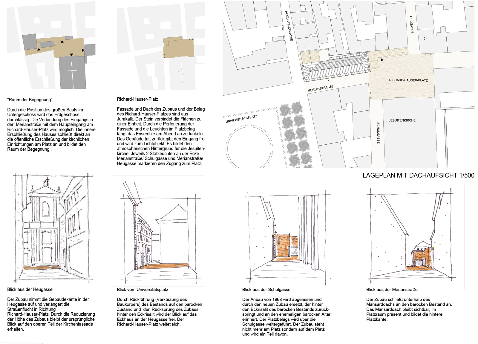 Der öffentliche Raum setzt sich im Gebäude durch die passagenartige Erschließung fort, während die Barockfassade freigestellt und auf ihre ursprünglichen Ausmaße zurückgebaut wird. Der Platz vor der Jesuitenkirche wird gefasst durch einen winkelförmigen Baukörper, der durch sein gläsernes Erdgeschoss einerseits die neugewonnene Offenheit und Transparenz kirchlicher Organisationen symbolisiert, andererseits durch die geschichtete Steinfassade aus Jurakalk, durch deren Öffnungen das Gebäude in den Platzraum strahlt, dem schmalen Baukörper die nötige Schwere verleiht und die Platzkante klar definiert.