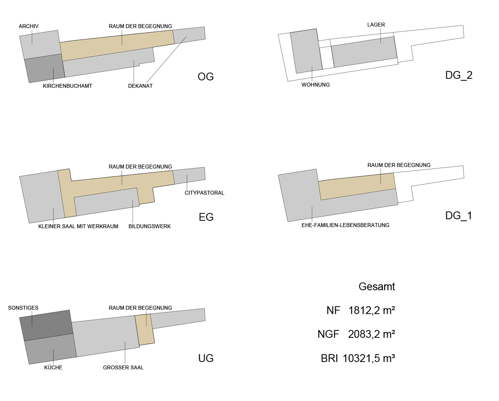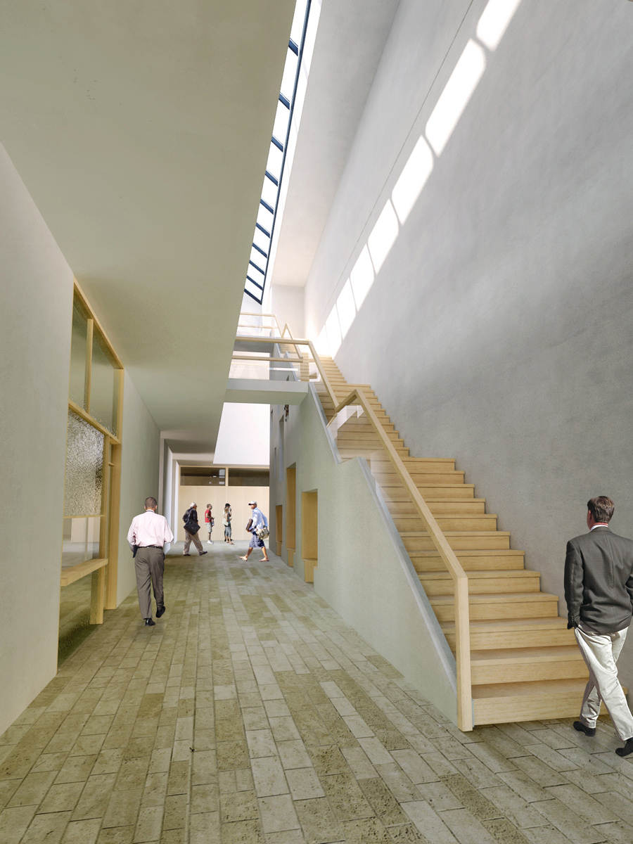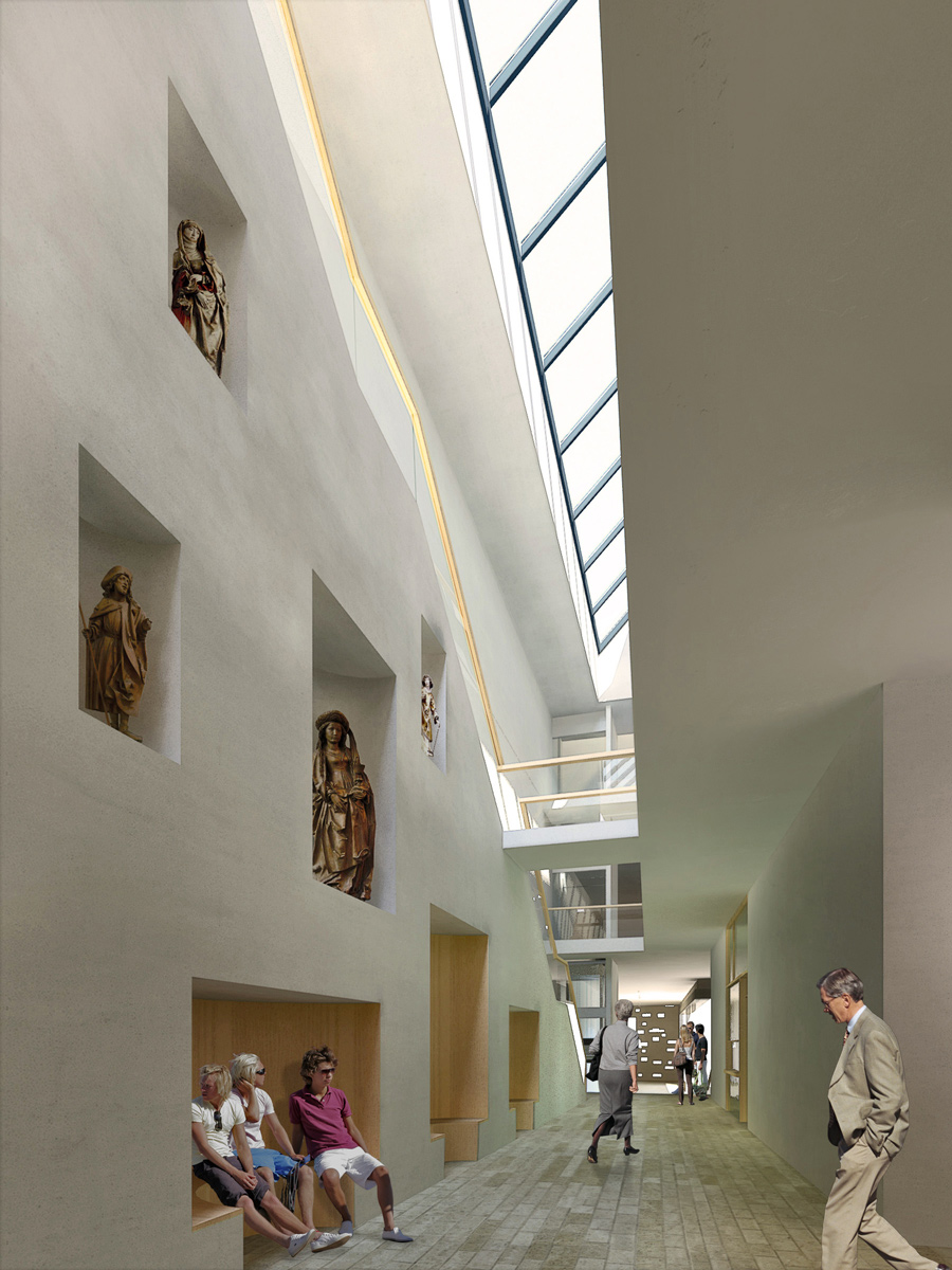 Der Raum der Begegnung selbst besteht aus einer dreigeschossigen Erschließungshalle mit einer skulpturalen „Himmelstreppe“, mit Ausstellungskonchen, Stegen und Brücken sowie einem langen, in die Dachhaut geschnittenen Oberlichtband. Hier befinden sich neben dem Foyer das Bildungswerk, die Zugänge zum Dekanat, zum Kirchenbuchamt und zu den Beratungsstellen. Es entsteht ein klar gegliedertes Haus mit größtmöglicher Offenheit, das den Gedanken, ein gemeinsamer Ort für die kirchlichen Dienste zu sein, ernst nimmt. Der neue, steinerne Platzbelag setzt sich in den öffentlichen Bereichen des Hauses fort, das Gebäude beginnt bereits auf dem Platz, und der Platz nimmt sich, einem Teppich gleich, Raum im Haus. Der große Licht-Raum der Passage erinnert an die Gassenstruktur der Altstadt, schafft Plätze und Wege, Durchblicke und öffentliche wie intime Bereiche. Der große Saal im Untergeschoss ist vom Platz aus einsehbar und über das zweigeschossige Foyer direkt mit dem Eingang verbunden, während der kleine Saal das Ende der Passage markiert. Dadurch sind auch getrennte Veranstaltungen störungsfrei durchführbar.