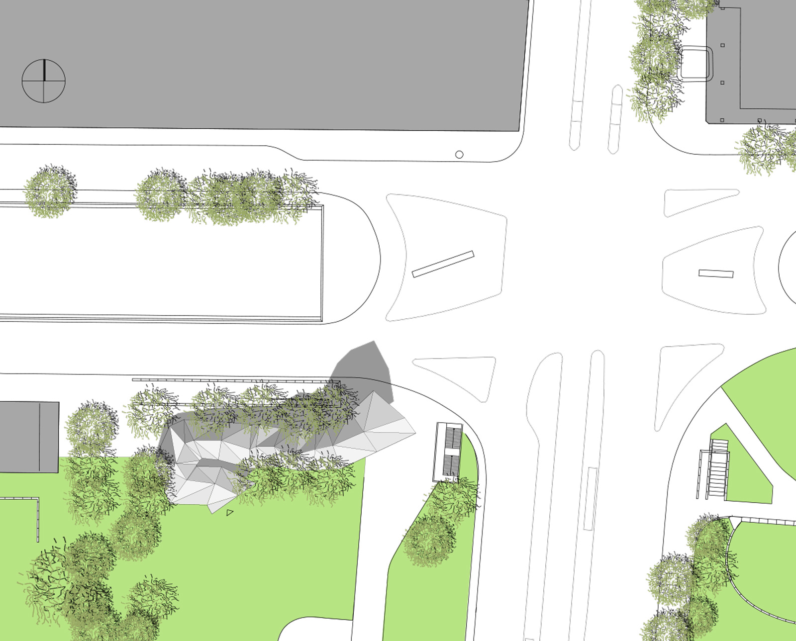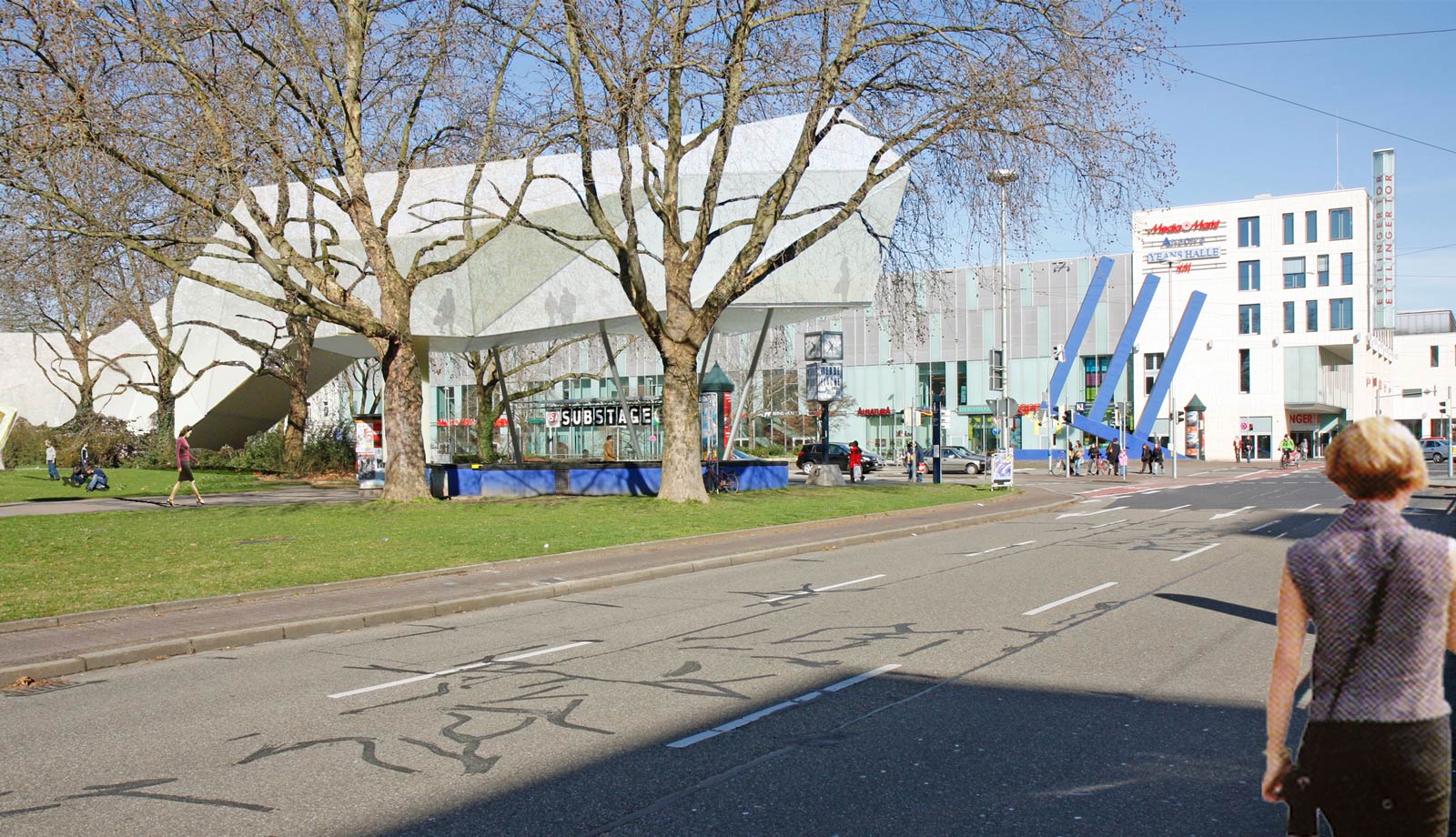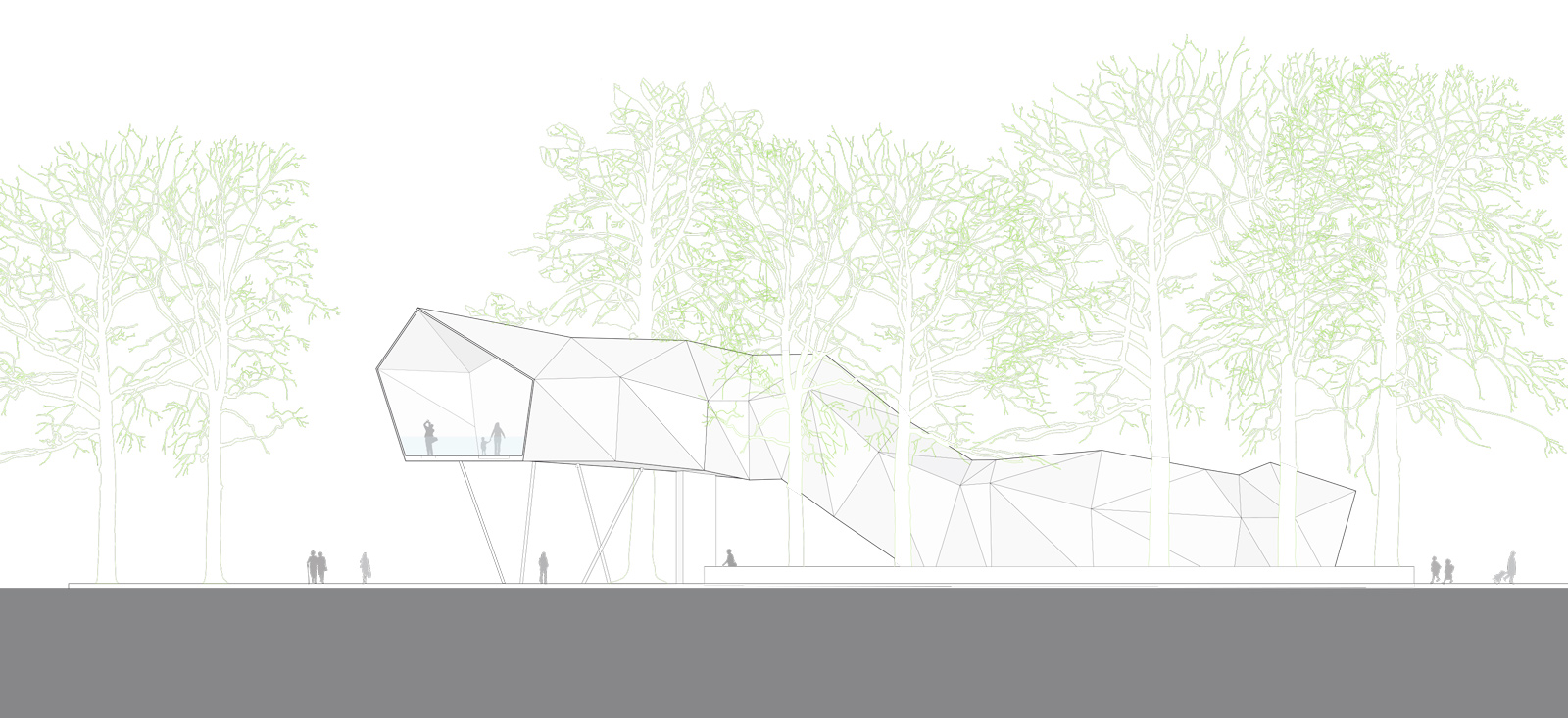 Einem Tatzelwurm gleich schiebt sich der Pavillon zwischen den Bäumen hindurch, um sich schließlich in die Höhe zu stemmen, als Zeichen in der Stadtlandschaft, als Aussichtsplattform für die Besucher, um einen Überblick über die Bauarbeiten am Ettlinger Tor gewinnen zu können. Damit bedient das „Tier“ neben der städtebaulichen mehrere metaphorische Ebenen.