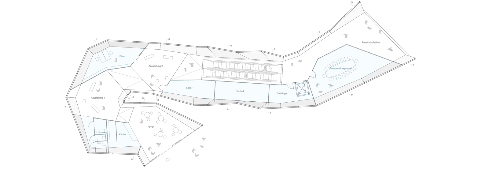 Das Raumfachwerk aus Stahlbindern ist von einer transluzenten Hülle aus prismatisch angeordneten Doppelstegplatten umgeben, die einen dynamischen Innenraum erzeugen. Trotz der expressiven Faltung strahlt das Innere der Konstruktion durch seine Lichtstimmung große Einfachheit und Ruhe aus. Der röhrenartige Körper ist als Ausstellungsraum hervorragend geeignet, den linearen Prozess der Baustelle eines Tunnels zu illustrieren.