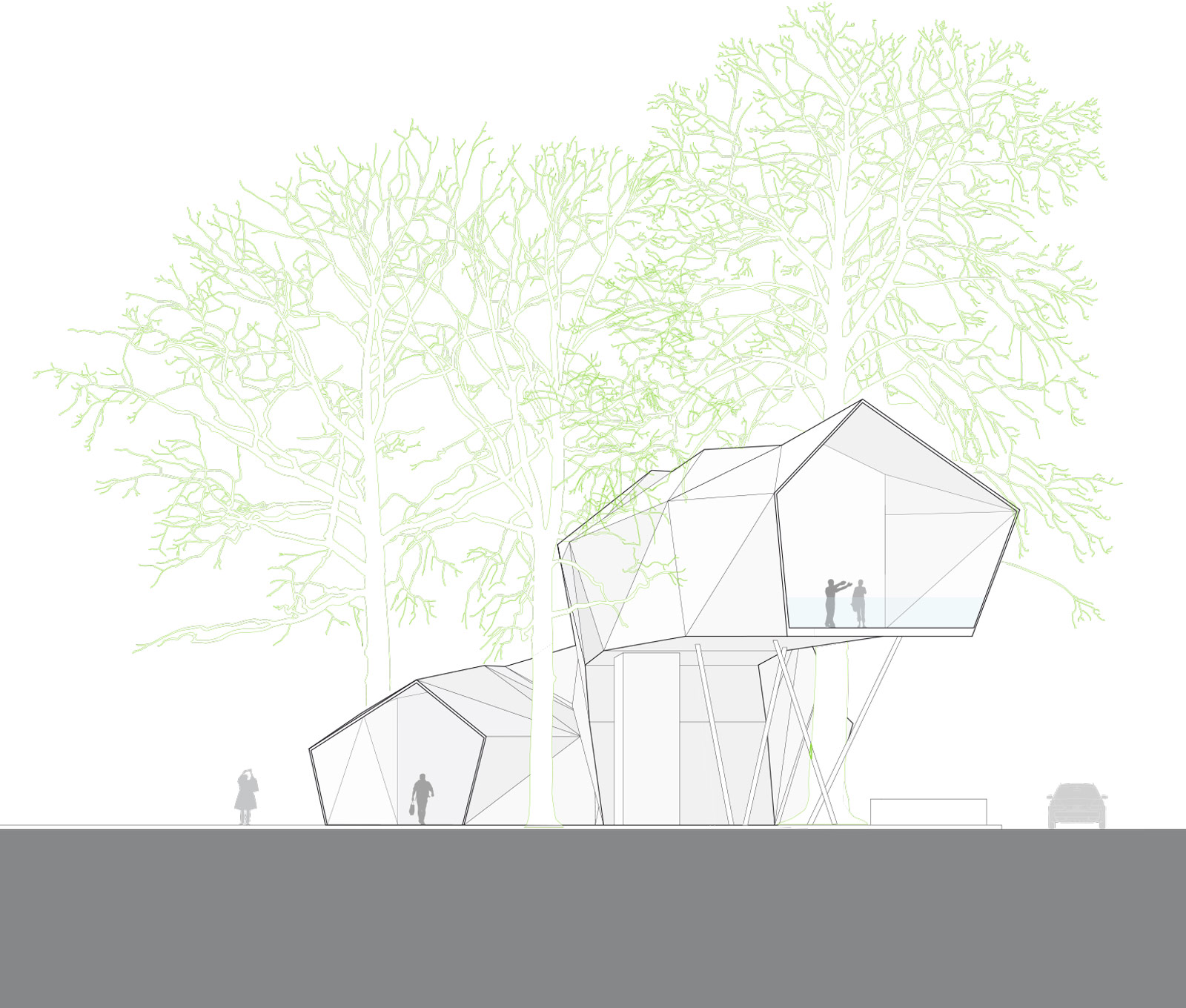 Über eine sanft ansteigende Rampe mit Café wird der Pavillon von Südosten her betreten. Die Ausstellung begleitet den Besucher kontinuierlich bis zur Rolltreppenanlage, die statt in die Tiefe des Tunnels in die lichte Höhe der Baumwipfel führt.