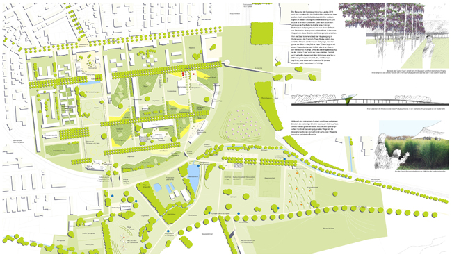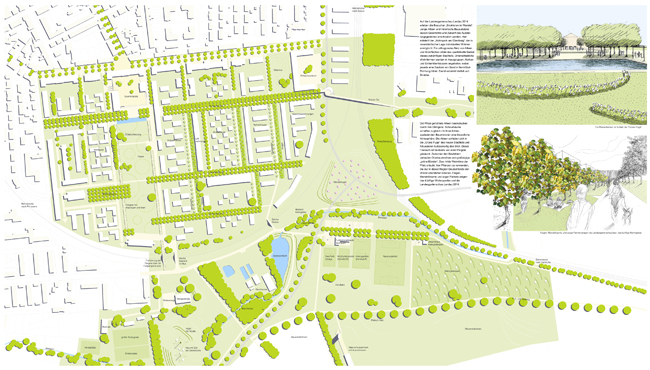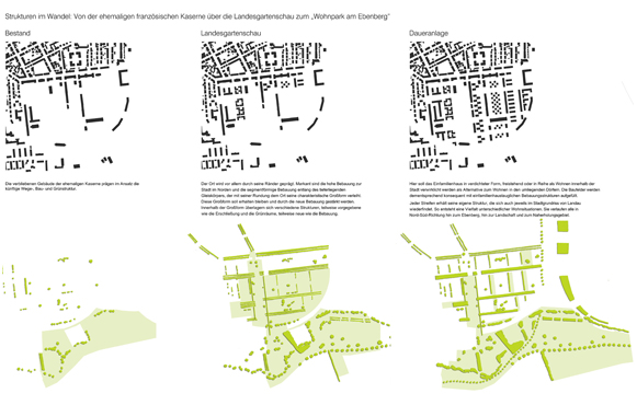 Innerhalb der Großform überlagern sich verschiedene Strukturen, teilweise vorgegebene wie die Erschließung und die Grünräume, teilweise neue wie die Bebauung.