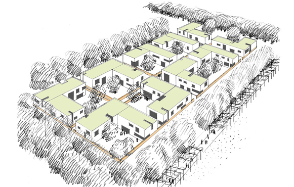 Zur Landesgartenschau soll der Bebauungsstreifen westlich der grünen Fuge als Mustersiedlung bebaut werden. Die Struktur sieht einen L-förmigen, 2-geschossigen Baukörper vor. Durch die besondere Form entsteht ein zweiseitig geschützter Außenraum.