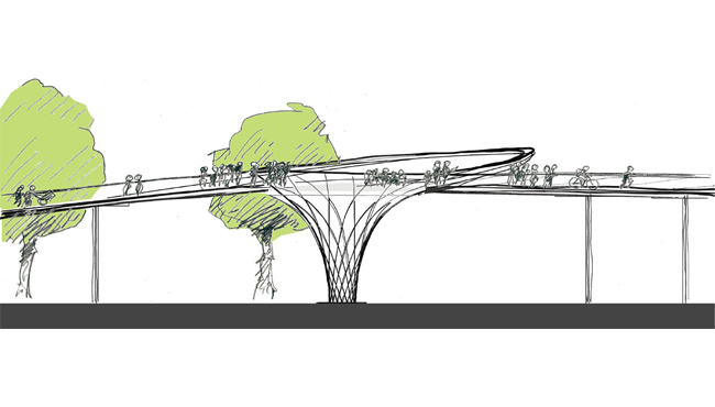 Die beiden losen Enden, die in Ost- West-Richtung zu verbinden sind, liegen versetzt zueinander. Durch die Aufnahme beider Richtungen und deren Umlenkung direkt über dem geplanten Kreisel kommt es zum Brückenschlag. Der entstehende Platz in der zweiten Ebene wächst aus dem Boden gleich einer Blume. Mit Ihrem großen Kelch erinnert sie an eine Callablüte. Sie wird zum Signet an diesem wichtigen Verkehrsknotenpunkt und sorgt gleichzeitig für die markante Gestaltung der Kreiselfläche.