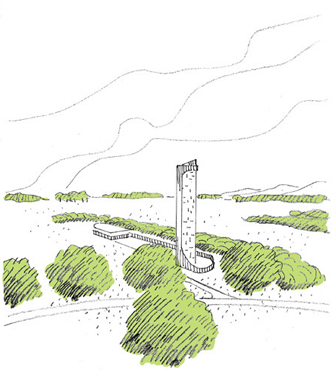 Das Naturschutzzentrum und der Aussichtspunkt sind als räumliche Einheit geplant. Der Ansatz ist beide Funktionen - Forschung auf der einen Seite, Attraktion der Aussicht auf der anderen - zusammenzufassen, um eine größtmögliche Außenwirkung für das Naturschutzzentrum zu erreichen,. Baulich formuliert sich das in der Abwicklung einer Wand, die sich um beide Bauwerke legt und zu einem Gebäude zusammenfügt: die Außenwand des Zentrums wird weitergeführt, wird zur Platzwand und geht über in die tragende Wand des Turms, die sich in einer Art Spirale nach oben windet. Der Platz der sich zwischen Turm und Zentrum aufspannt empfängt den Besucher und verortet das Naturschutzzentrum mit Aussichtsturm in der Landschaft.