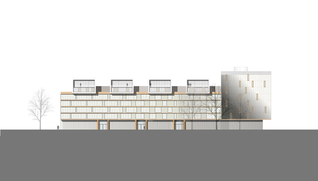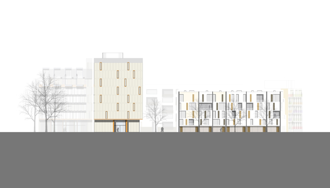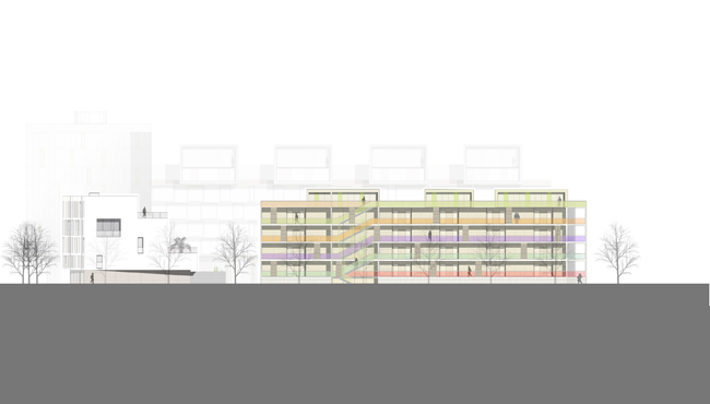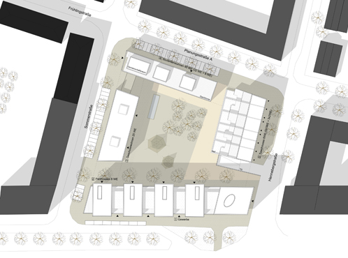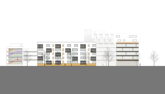 Damit entstehen vier unterschiedliche Gebäude, denen verschiedene Nutzungen und Typologien zugeordnet werden - Stadthäuser, Bürozeilen mit aufgesetzten Maisonetten, ein Studentenwohnheim und klassischer Geschosswohnungsbau. Die Durchwegung des Hofes schafft die notwendige Verzahnung mit dem bestehenden Quartier. Die unterschiedlichen Typologien sorgen für eine lebendige Durchmischung des Blockes und die Ansprache einer breiten Zielgruppe.