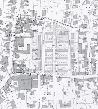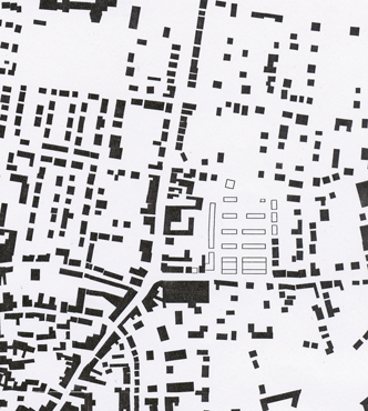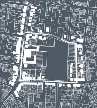 Die vorgeschlagene Bebauung auf dem Areal am Lütkeweg wird durch die städtebaulichen Rahmenbedingungen der ortstypischen Gemengelage charakterisiert. Wie im Schwarzplan ersichtlich, liegt das Gebiet im Übergangsbereich der verdichteten Kernstadt zur lockeren, teilweise strukturbildenden Bebauung der umliegenden Viertel.