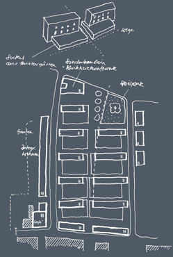 Das stark durchgrünte Gebiet weist zur Karlstraße hin einen großen, zusammenhängenden Spielbereich auf. Jeder Zeile ist ein durch Aushubmaterial gebildeter Sockel aus Mietergärten vorgelagert, der zusammen mit den Erschließungswegen das vielfältige Raumgefüge des Quartiers bestimmt. Durch die einheitliche Baustruktur ist eine flexible Nutzungsmischung zwischen Reihenhäusern und Geschoßwohnungen sowie die Realisierung in unterschiedlichen Bauabschnitten problemlos möglich.