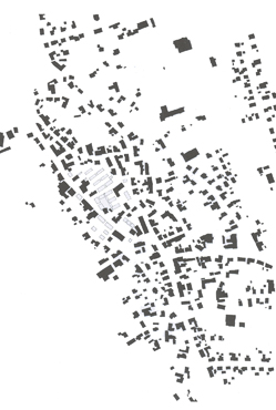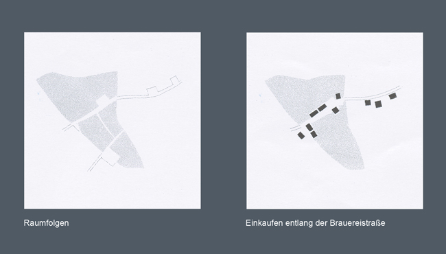 Öffentlicher Straßenraum wird von dem privaten Binnenraum deutlich unterschieden, es erfolgt eine klare Differenzierung in Fahr- und Fußverkehr. Während die schnelle Verbindung Nord-Süd erfolgt (Kfz, Bahn, Fluss), sind die langsameren Durchwegungen Ost-West gerichtet (Anlieger, Fußgänger). Daher legen wir auf eine verstärkte Anordnung von Läden an der Ost-West-Verbindung Wert. Typologisch sollte der Einzelhandel weiterhin gestreut bleiben und nicht konzentriert werden.