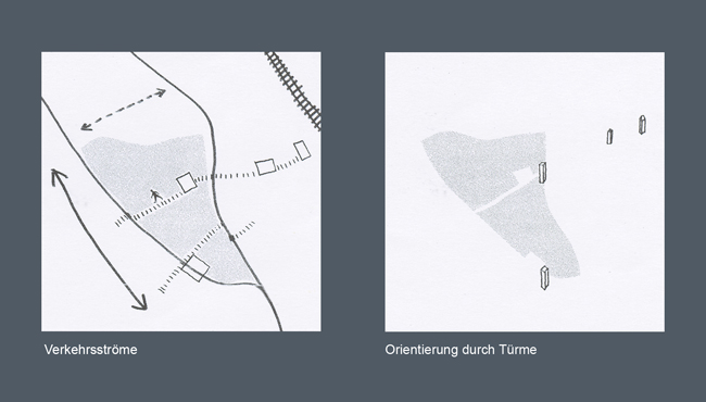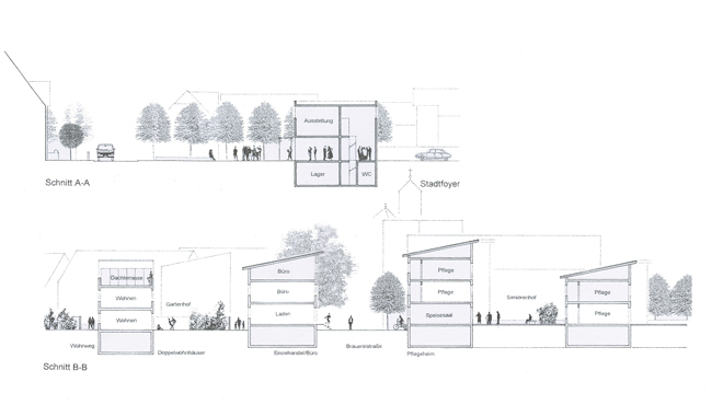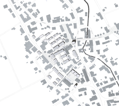 Die Türme des Ortes (Kirche, Jugendturm, Stadtschreiberturm) fungieren als Gelenke. Hinter dem Geschäfts- und Dienstleistungs-Riegel befindet sich eine Wohnsiedlung mit Gartenhöfen in zweiter Reihe. Auch das Altenpflegeheim verfügt über derart introvertierte Binnenbereiche.