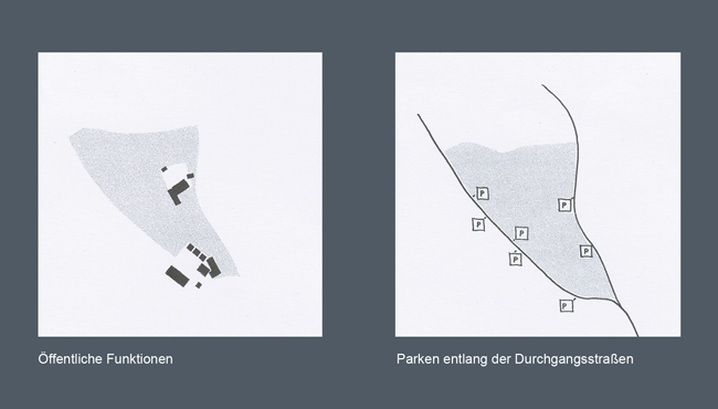 Die Respektierung und Stärkung der dörflichen Struktur des Ortskerns ist das Leitthema unseres Wettbewerbsbeitrags. Typische Merkmale der Siedlungsstruktur werden herausgearbeitet, die Umgebung dient als Maßstab. Die Umnutzung von Bestandsimmobilien hat Vorrang vor dem Neubau.