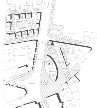 Buderusplatz: Einen Platz zu schaffen, der trotz der Beeinträchtigungen durch den Verkehr hohe Aufenthaltsqualitäten bietet, aber dennoch nicht im Verborgenen, sondern in den Schnittpunkten der Stadt liegt, war der Ausgangspunkt der Überlegungen.
