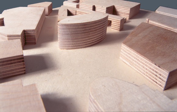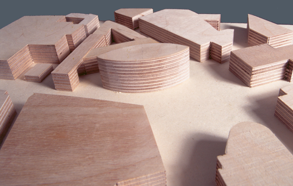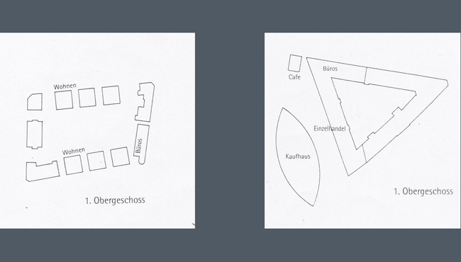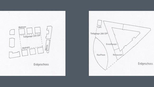 Das als Solitär ausgeformte Kaufhaus teilt diesen Platz in die verschiedenen Nutzungsbereiche und schafft ruhige, geschützte Binnenbereiche, ohne den räumlichen Zusammenhang des Platzes zu unterbrechen.