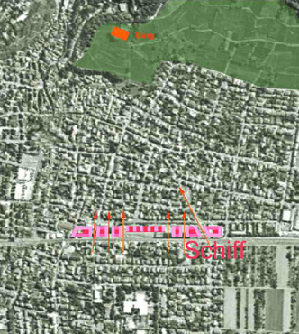 Schiff und Bewegung: Die Durchquerung des Schiffes unterliegt unterschiedlichen Rahmenbedingungen und Frequentierungen: die Fahrgäste wenden sich vom Bahnhof vorwiegend zu Fuß nach Norden: über die nördliche Kopfseite wird die Altstadt angebunden, durch die Unterführung werden die Schüler strömen. Die Pkw-Anbindung findet über die Schillerstraße statt.