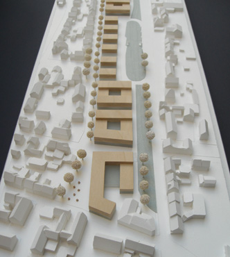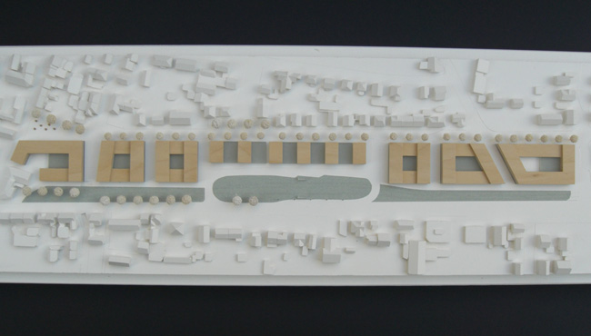 Baustein < Riegel >: Durch seine Position direkt am Umsteigeplatz erhält dieser Riegel eine besondere Bedeutung: er markiert den neuen Bahnhof Schriesheim. Nach Osten bildet er den räumlichen Abschluss der Theodor-Körner-Straße und einen Platz. Durch die Strukturierung des Baukörpers wird der Maßstab der angrenzenden Wohnbauten aufgenommen: das Gewerbegeschoss bildet die Basis für zweigeschossige Wohnriegel mit reihenhausartigen Maisonettewohnungen und Garten. Damit wird der Riegel zu einem wieder erkennbaren Baukörper, der zwischen Bahnhof und Wohnen vermittelt. Die Gewerbezone im EG wird zur Ladenzeile, die sich zum Bahnhofsplatz orientiert. Die Stirnseiten der Riegel bieten die geforderten Fahrradabstellmöglichkeiten, Park & Ride Stellplätze sind in der Tiefgarage untergebracht.