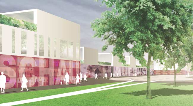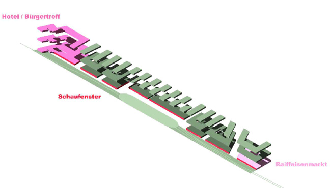 Ein neues Angebot an einer bestens erschlossenen Position setzt sich ab durch ein zusammenfassendes Grundkonzept mit optimaler Ausnutzung der wertvollen innerörtlichen Fläche und mit einer großen Körnung der Einzelbauten. Neue Wohn- oder Gewerbegebiete am Stadtrand werden dadurch vermieden.