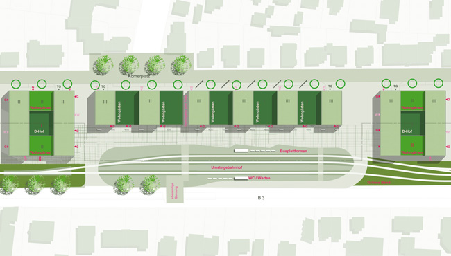 Schiff und Bahnhof: Neben der Baustruktur ist der zweite das Areal prägende Aspekt die Verkehrsfunktion < Umsteigebahnhof >. B3 und Schienen geben den kompakten Baukörpern begleitend Raum; Busfahrspur und Umsteigeplattform belegen und bilden das inhaltliche Zentrum: zu Zeiten des bewussten Umgangs mit Ressourcen wird der öffentliche Nahverkehr eine immer wichtigere Rolle einnehmen. Der Bahnhof wird häufig frequentiert und wird zu einer Image unterstützenden Adresse für Gewerbe, Dienstleistung wie Wohnen.
