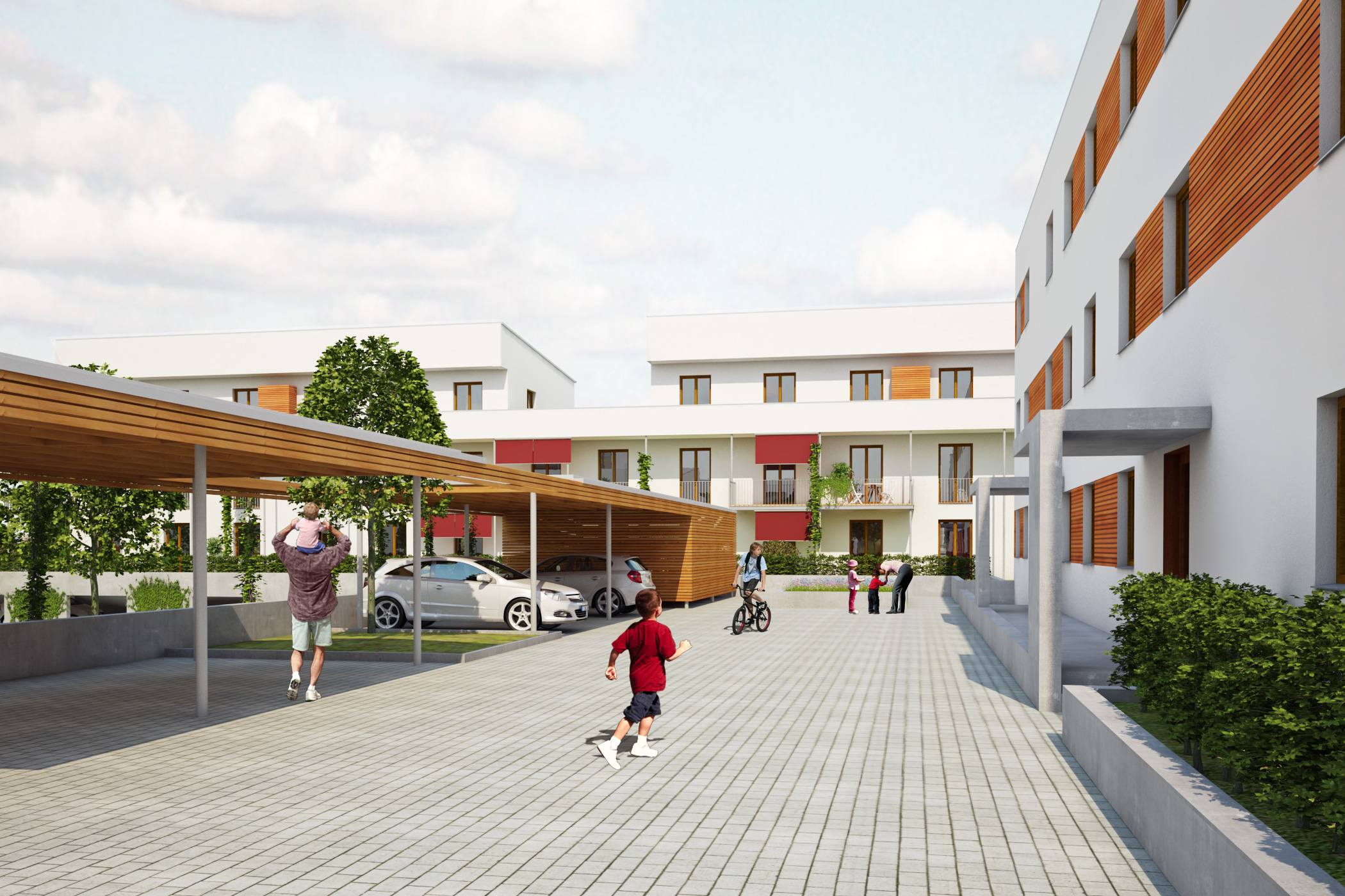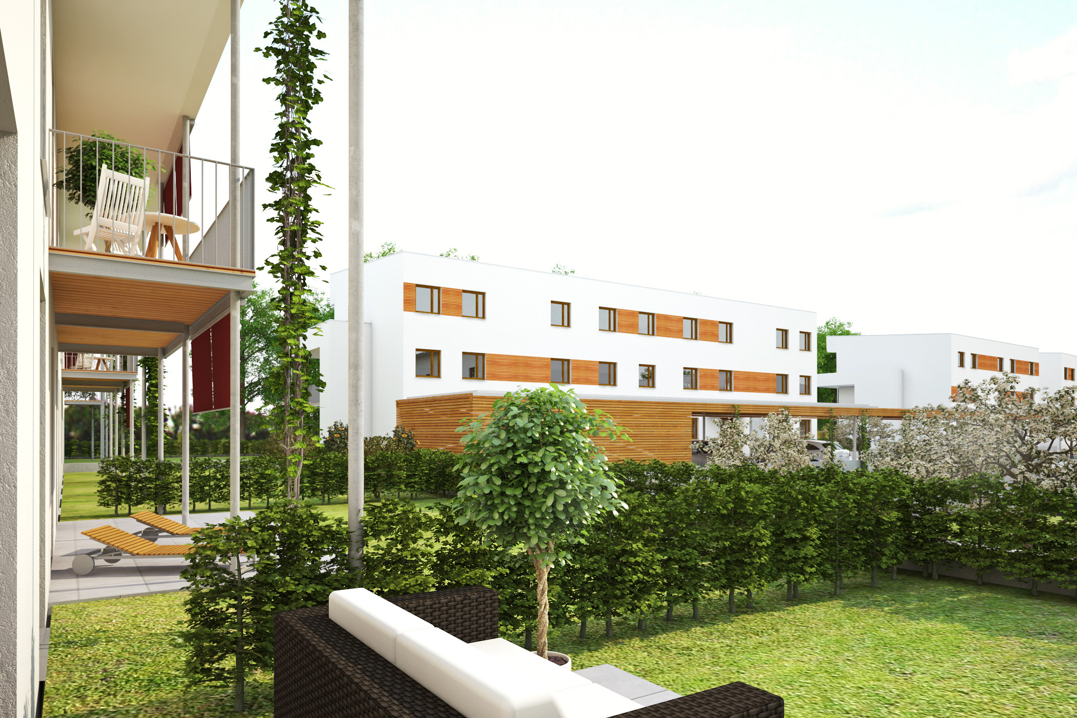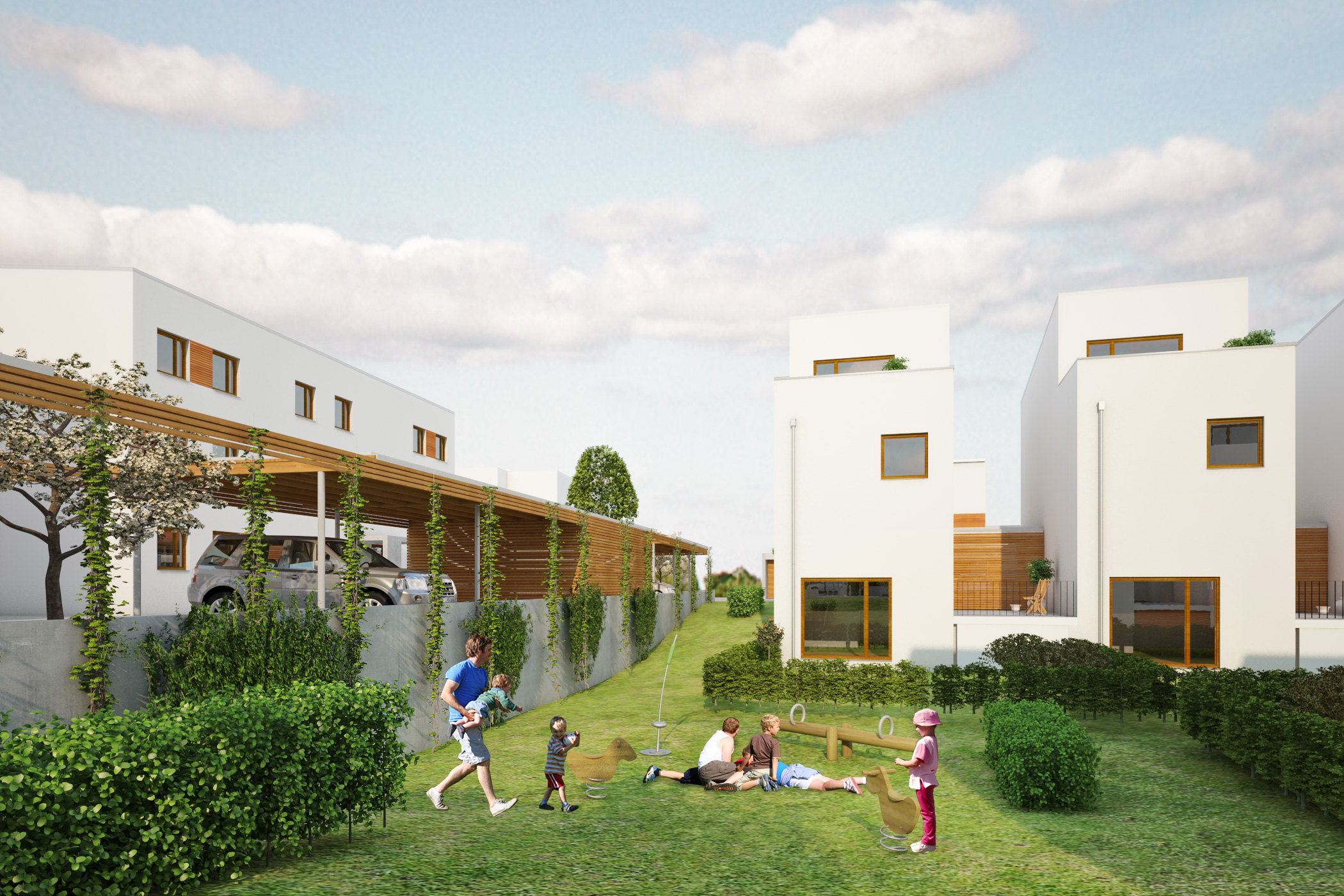 Die Bebauung trägt den unterschiedlichen Gegebenheiten Rechnung und unterscheidet in eine straßenbegleitende Bebauung mit Geschosswohnungsbau und einer "Füllung" der Parzelle mit verdichteter Einfamilienhausbebauung. Während erstere ein eher vorstädtisches Wohnen in 2 bis 5 Zimmerwohnungen mit Gartenanteil, umlaufenden Balkonen und Tiefgarage in Zwei- und Dreispännern vorsieht, sind die Einfamilienwohnhäuser als Doppelhäuser und Hofhäuser mit Gärten, Höfen, Dachterrasse und Carport organisiert. Durch die Ausnutzung des gegenüber der Straße tieferliegenden Geländes werden hohe Wohnräume und ruhige Gartenzonen geschaffen. Die Kleinteiligkeit der Einfamilienhausbebauung erlaubt eine individuelle dörfliche Adressbildung. Die Doppelhäuser entlang der Ringstraße nehmen die Körnigkeit der Nachbarhäuser auf und umrahmen die verdichteten Hofhäuser mit dem Spielplatz.