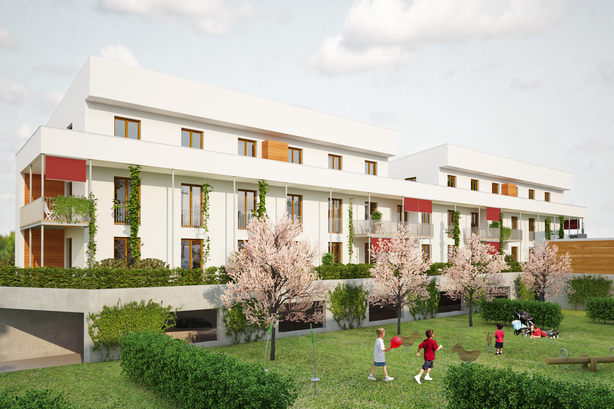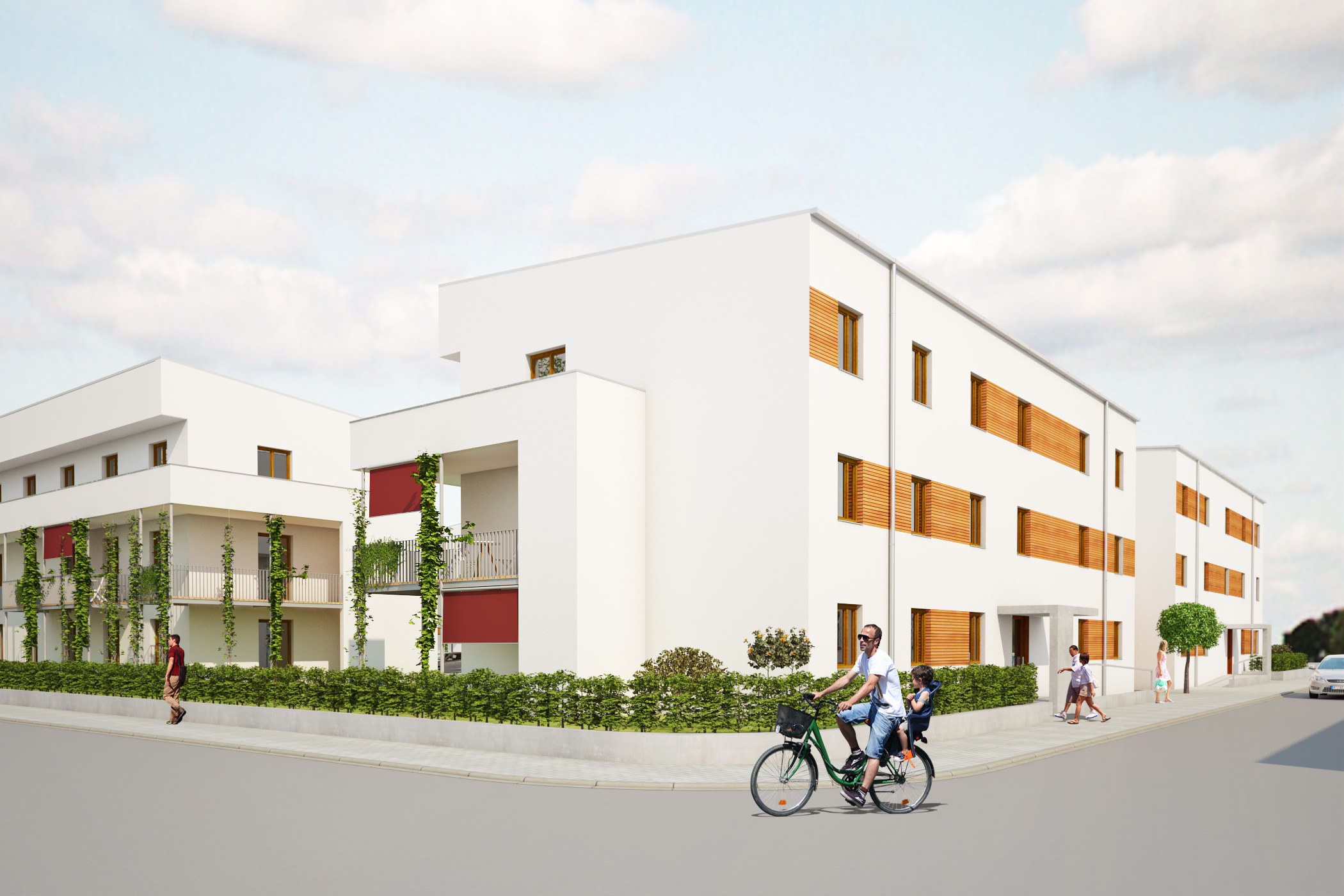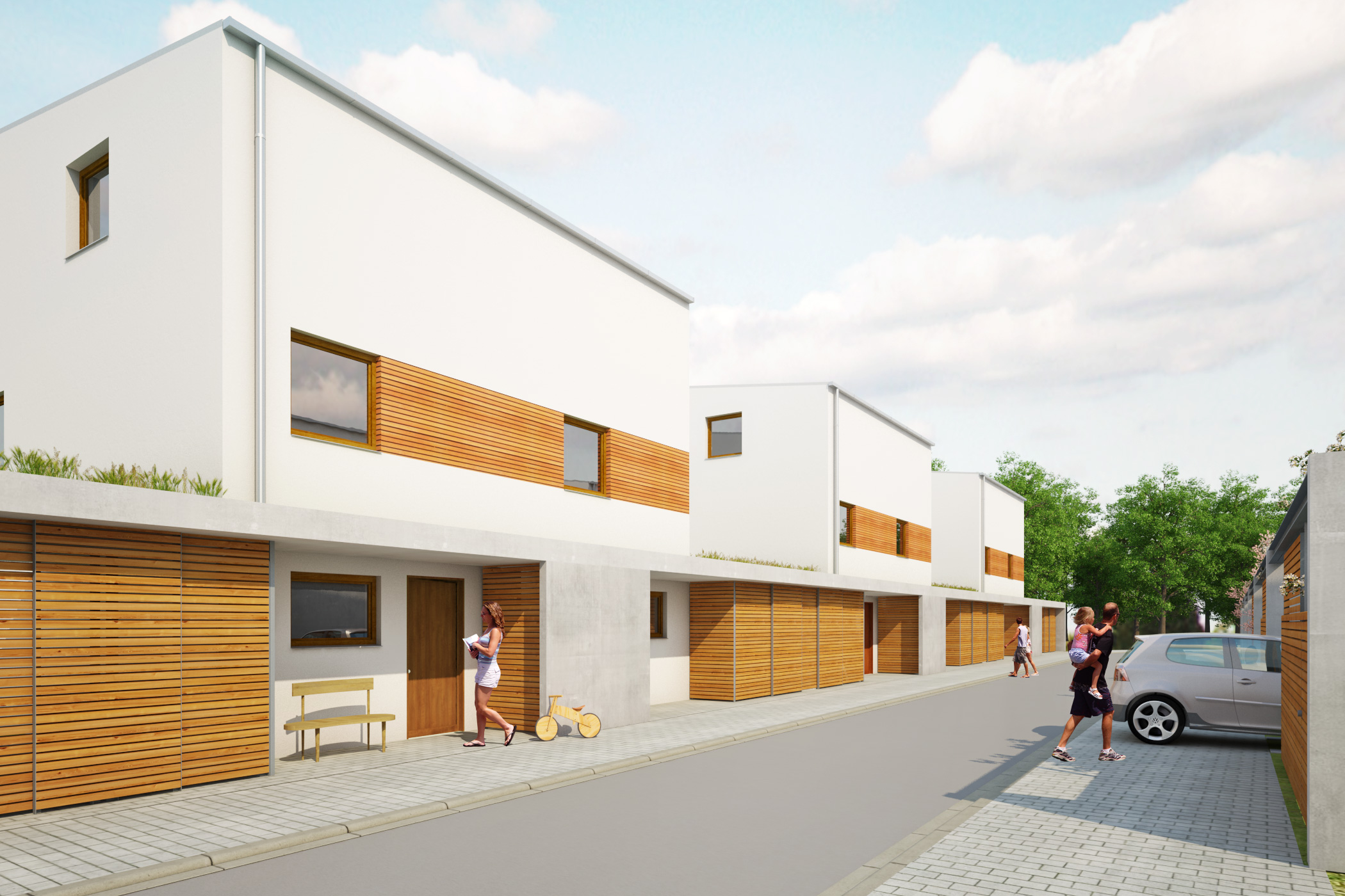 Die Bebauung trägt den unterschiedlichen Gegebenheiten Rechnung und unterscheidet in eine straßenbegleitende Bebauung mit Geschosswohnungsbau und einer "Füllung" der Parzelle mit verdichteter Einfamilienhausbebauung. Während erstere ein eher vorstädtisches Wohnen in 2 bis 5 Zimmerwohnungen mit Gartenanteil, umlaufenden Balkonen und Tiefgarage in Zwei- und Dreispännern vorsieht, sind die Einfamilienwohnhäuser als Doppelhäuser und Hofhäuser mit Gärten, Höfen, Dachterrasse und Carport organisiert. Durch die Ausnutzung des gegenüber der Straße tieferliegenden Geländes werden hohe Wohnräume und ruhige Gartenzonen geschaffen. Die Kleinteiligkeit der Einfamilienhausbebauung erlaubt eine individuelle dörfliche Adressbildung. Die Doppelhäuser entlang der Ringstraße nehmen die Körnigkeit der Nachbarhäuser auf und umrahmen die verdichteten Hofhäuser mit dem Spielplatz.