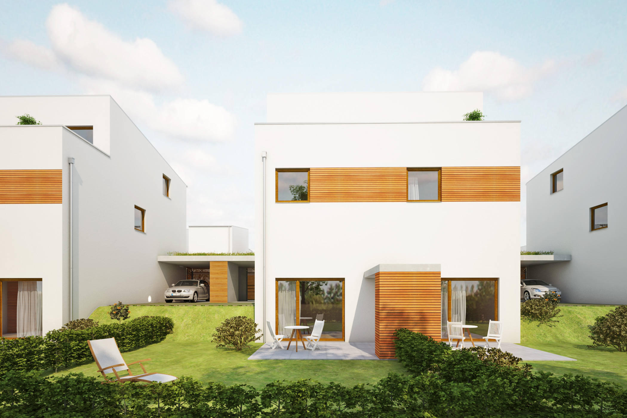 Die Doppelhäuser und Hofhäuser sind in ihrer Art und Körnung wie die alten Dorfhäuser jedoch ohne Nutzgarten und Scheune, aber mit Carport, Hof und Ziergarten. Der besondere Umstand, dass die Straße höher als das Gelände liegt, wird in die Planung mit einbezogen. Der Grundriss passt sich der Gegebenheit an und folgt mit seinen Ebenen dem Gelände. Über geschickt platzierte Treppen werden die Ebenen miteinander verbunden. Es entstehten zum Garten ca. vier Meter hohe Wohnräume. Gleichzeitig ragt das Untergeschoss bei den Hofhäusern soweit gartenseitig heraus, dass ein Raum vollwertig belichtet werden kann. Bei den Hofhäusern werden die Räume über eine Splitlevel-Treppe erschlosse, die bis ins Untergeschoss führt, bei den Doppelhäusern über eine kaskadenförmige Treppe, die den Wohnraum anbindet. So können bei den Häusern bis zu 5 Zimmer neben Küche, Wohn- und Esszimmer genutzt werden.