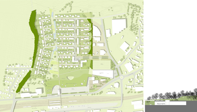 Der Entwurf versucht, auf die unterschiedlichen Anforderungen und Erwartungshaltungen an den Wettbewerb eine einfache, logische und zugleich zeitgemäße Antwort zu geben, ohne die räumliche und topographische Vielschichtigkeit des Areals preiszugeben. Der flächenmäßig größte Baukörper, das Baumarktcenter, nutzt den Niveauversprung der Hangkante und führt mit seinem begehbaren Dach die höher gelegene Siedlungsebene fort und macht so die attraktive Fläche für die Stadt und das neue Quartier nutzbar.