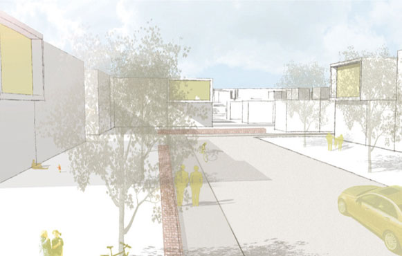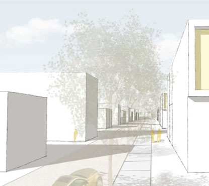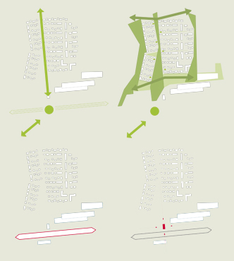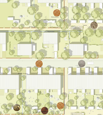 Die Identität von Mühlacker ist in hohem Maße mit der ehemaligen Ziegelei verknüpft; im östlichen Bereich schlagen wir deshalb vor, zu prüfen, ob nicht Teile der Bestandgebäude erhalten bleiben können, um ein identitätsstiftender Baustein für den neuen Stadtteil zu werden und gleichzeitig der tradionsreichen Geschichte der Ziegelei auch baulich ein Andenken zu wahren. Niedrige, sockelartige Einfriedungen zu den Wegen aus Ziegelsteinen erinnern im neuen Wohngebiet an die ehemalige Nutzung des Areals, wie auch die großmaßstäblicheren Bauten bevorzugt mit Ziegelfassaden zu errichten sind.