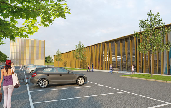 Das Fachmarktzentrum nimmt in Orientierung und Länge den Maßstab der Bahn auf; ein neues, turmartiges Verwaltungsgebäude dient als Landmark und wirkt in diesem Sinne im Übergang von der einen Stadtseite zur anderen. Eine große städtebauliche Rampe auf das Dach des Baumarkts leitet von dort aus in den neuen Stadtteil.