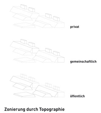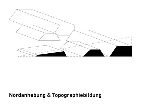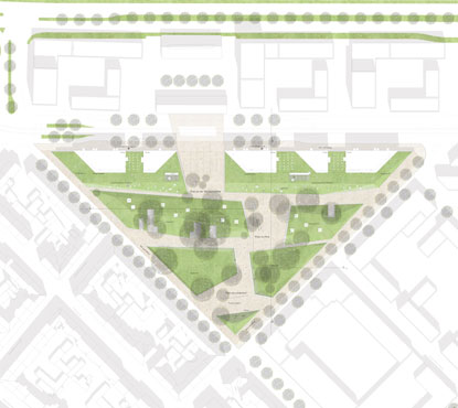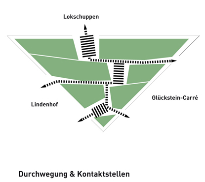 Er entsteht aus der topographischen Faltung der schräggeneigten Dreiecksfläche mit den vorhandenen Bäumen und den logischen Verbindungen in die Umgebung. Die Wege weiten sich zu platzartigen Flächen auf, die je nach Lage unterschiedlich programmiert werden. Ein besonderes Augenmerk liegt hier in der jeweiligen Aufenenthaltsqualität der Flächen. Trotz und mit den vielfältigen Eindrücken aus der Umgebung gelingt es, Räume mit sehr spezifischer Stimmung für unterschiedlichste sozialräumliche Ansprüche und Nutzungsmilieus zu erzeugen. Die Radwege werden um den kleinen Park herumgeführt. Die Faltung bringt den Park als pyramidaler 'Glückstein' mit tribünenartigen Sitzreihen zu einem räumlichen Abschluss.