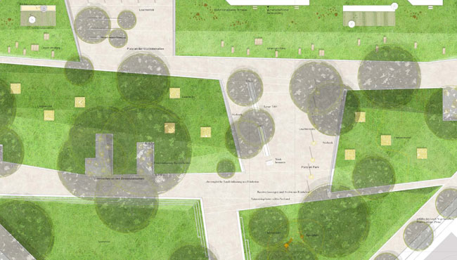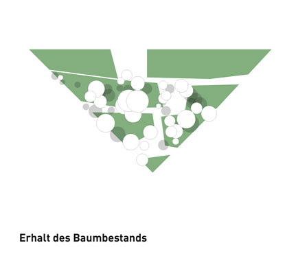 Grundidee ist es, das dreiecksförmige Grundstück des Parks als leicht südgeneigte Fläche auszubilden. Die charaktervollen Bestandsbäume werden zu einem großen Teil erhalten, mit ihnen wird die neue räumliche Struktur aufgebaut. Ein vielseitiges inneres Wegesystem erschließt den neuen Park und lädt zu einem kleinen Spaziergang ein.
