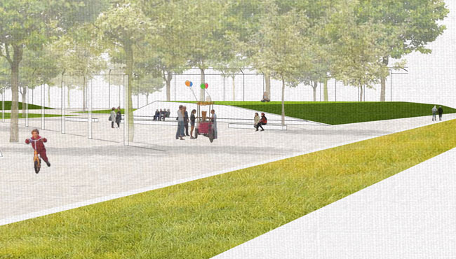 Die Verzahnung von Faltungen, Wegen und Flächen, den vorhandenen Bäumen und der Topographie führt zu einem weiten Spektrum an möglichen Nutzungen. Die Einfassungen der Wiesenflächen erfolgt aus hellen Feinbetonteilen, die Wegeflächen werden homogen aus flächigem Natursteinpflaster erstellt, in das die Baumscheiben farblich eingepasst werden. Die Gehsteige der angrenzenden Straßen erhalten den gleichen Belag und werden dadurch Teil des kleinen urbanen Parks.