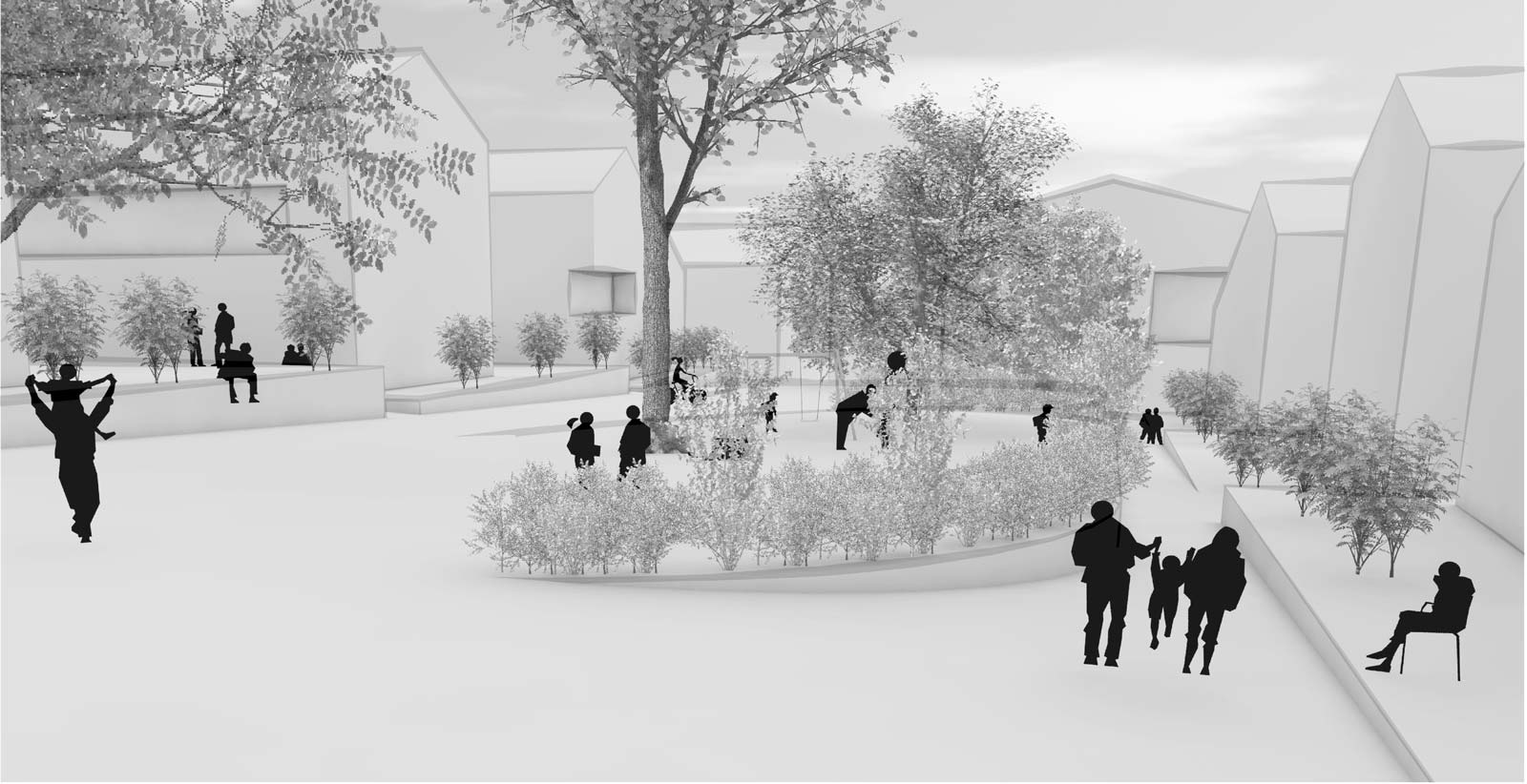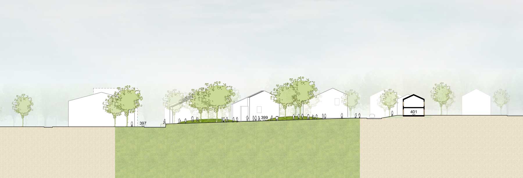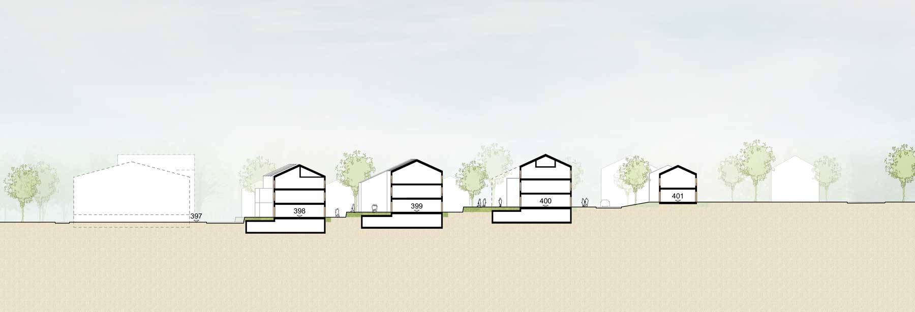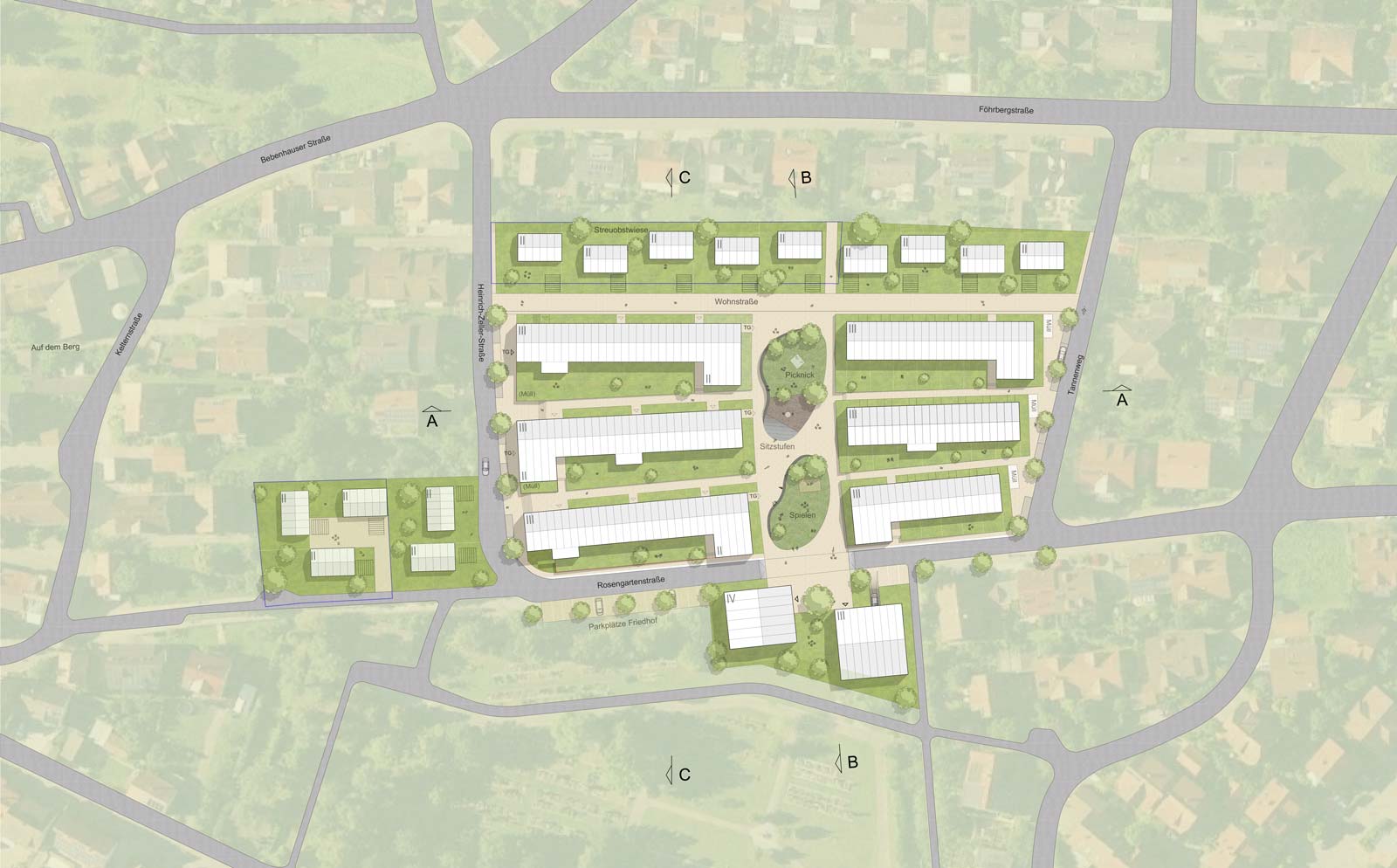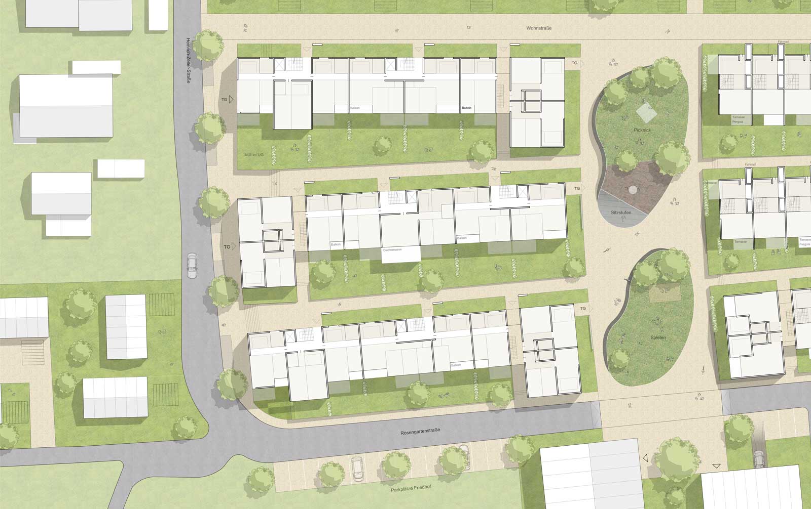 Ruhender Verkehr: Die Einfamilienhäuser erhalten ihre Stellplätze jeweils auf dem eigenen Grundstück; die Zeilen, sowohl der verdichtete Gechosswohnungsbau wie auch die Reihenhäuser, parken in einer der ihnen zugeordneten Tiefgarage. Ebenso erhalten die für die Baugruppen vorgesehenen Gebäude eine Tiefgarage.