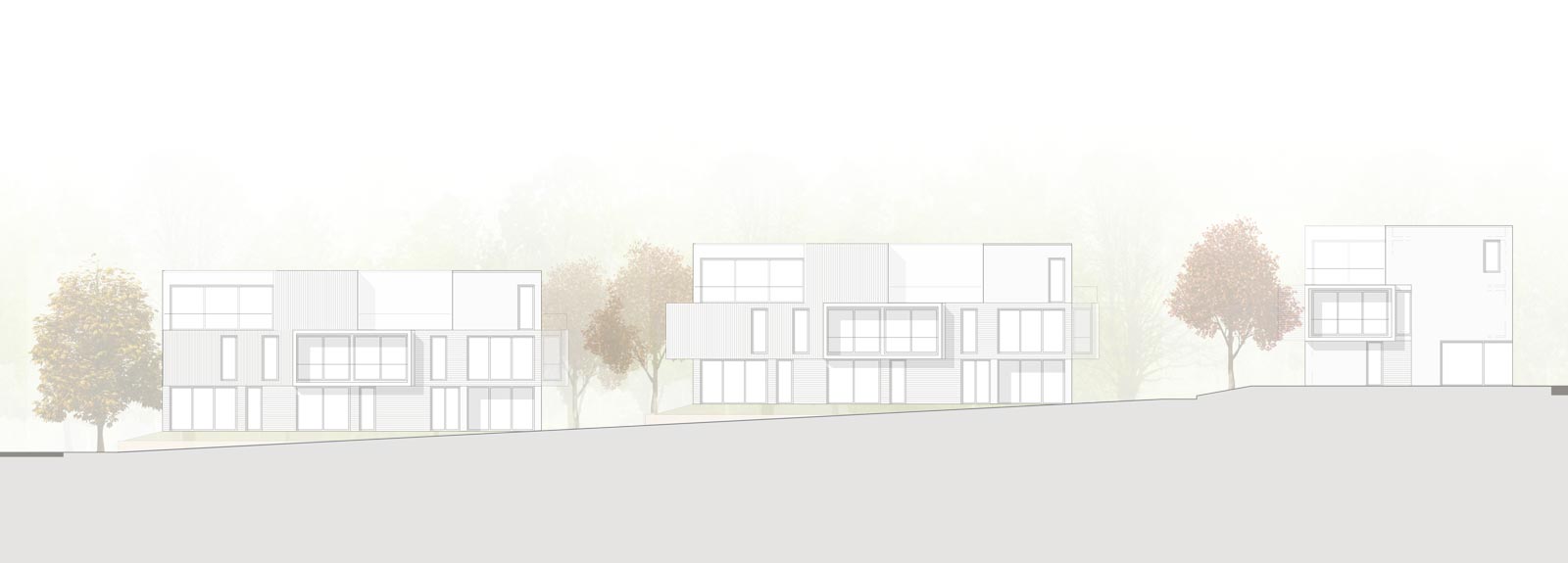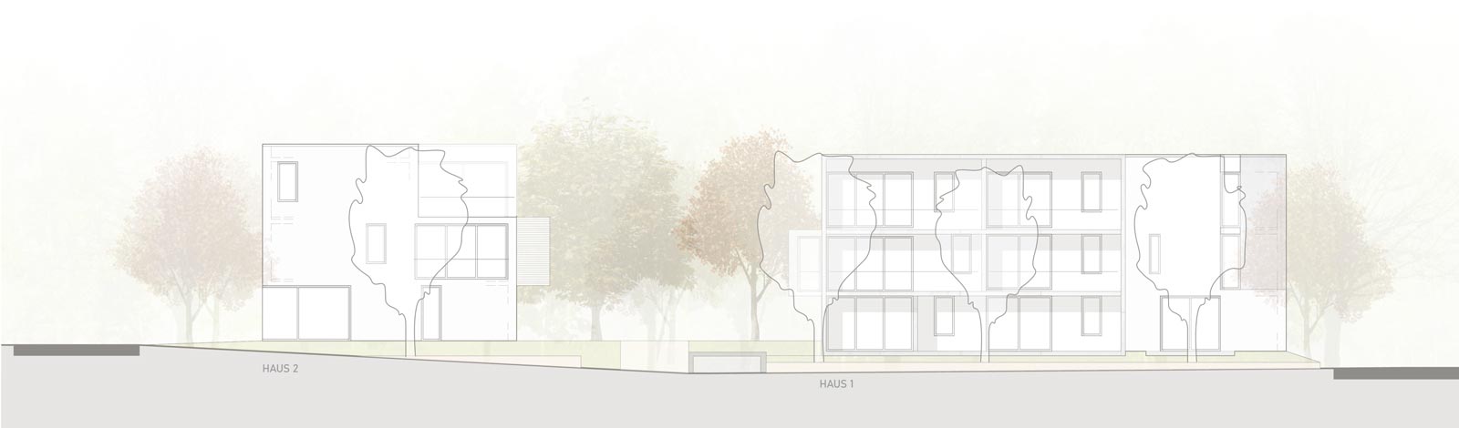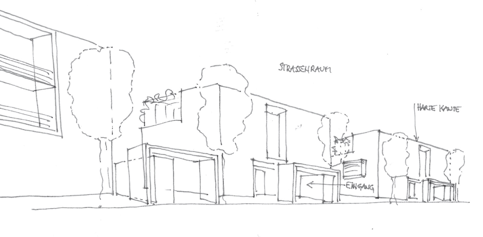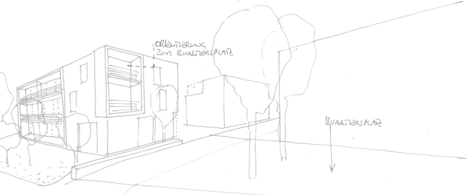 Das dem Quartiersplatz zugewandte Gebäude wird dabei städtischer aufgefasst. Mit einem sich öffnenden, einladenden Gestus zum Quartiersplatz hin, kann es die Funktion eines Auftaktgebäudes in das neue Wohngebiet übernehmen.