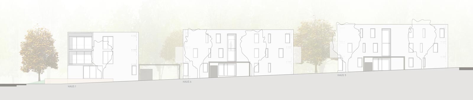 Die Gebäudeeingänge sind straßenseitig angeordnet, ein Bügel markiert dabei den Übergang vom öffentlichen Raum und bildet den Eingangsbereich mit Platz für Radstellplätze und ein seitlich angeordnetes Müllhäuschen. Der Zugang von der Tiefgarage erfolgt direkt in das Untergeschoss der Gebäude.