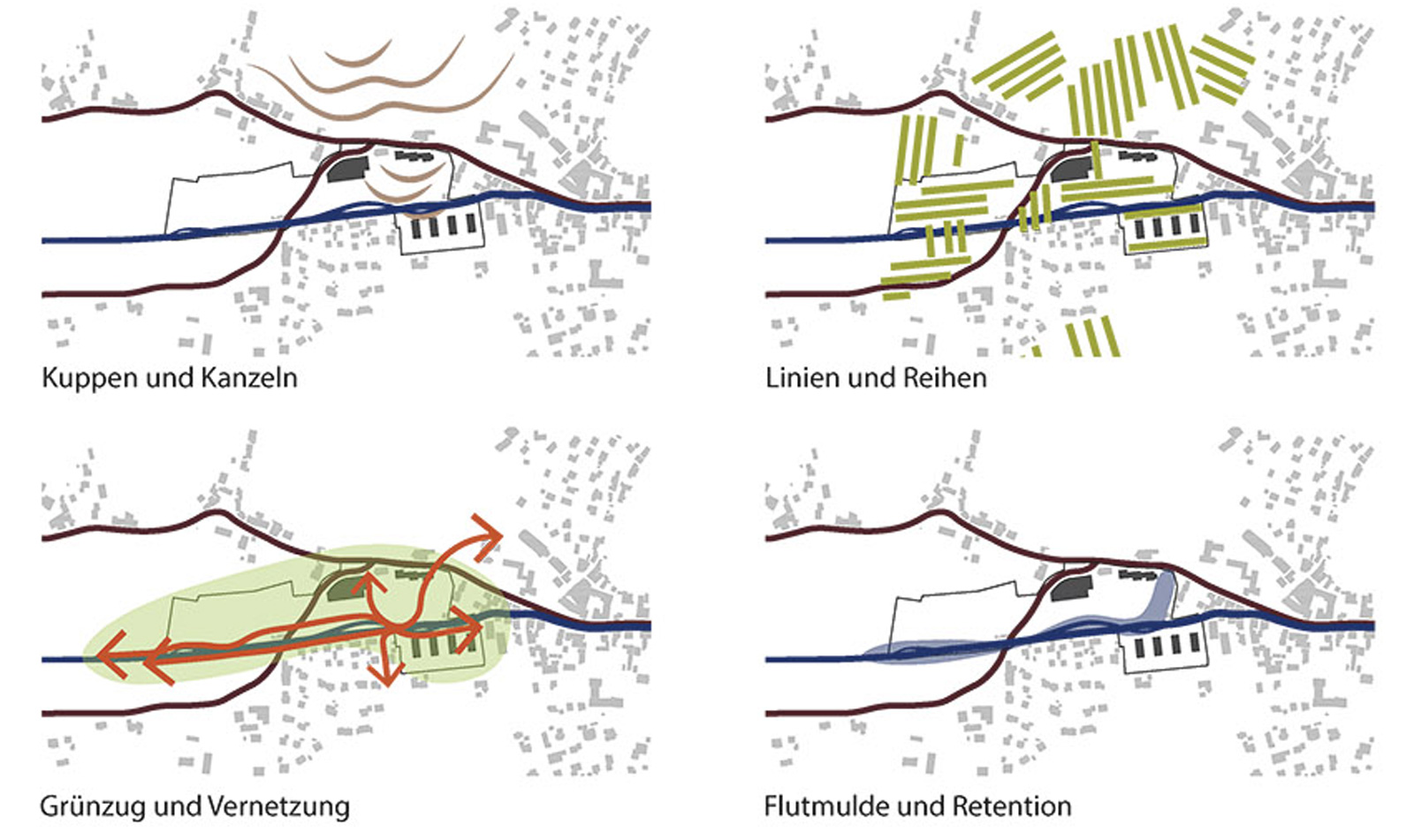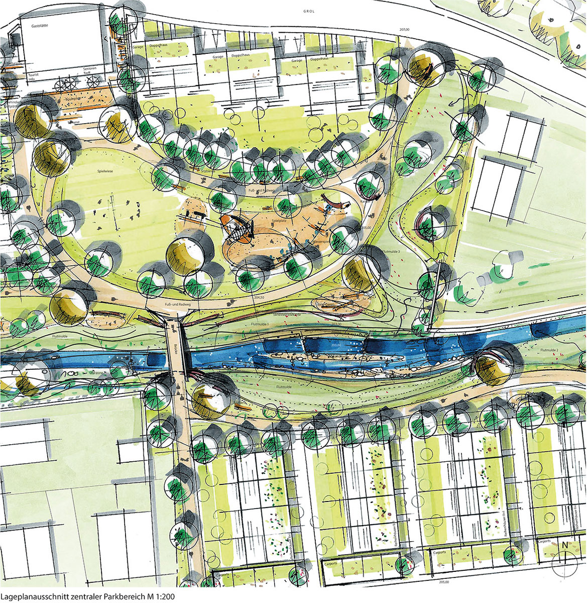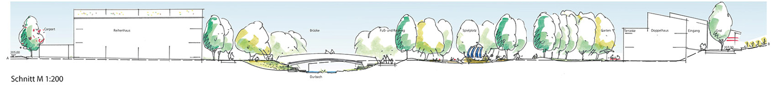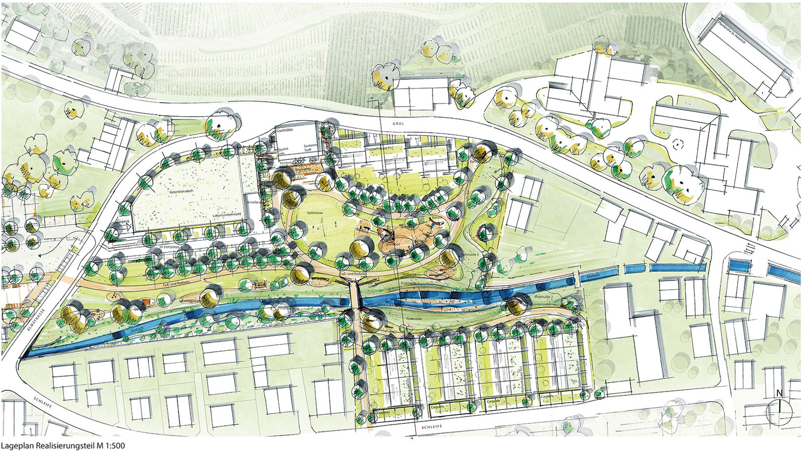 Im heutigen Zustand ist der Durbach vom Ortskern kommend bis hin zur Brücke der Almstraße kanalisiert und verbaut und weder für die Menschen noch für Flora und Fauna wirklich er-und belebbar. Der Entwurf sieht vor den Durbach zu renaturieren und ihm ein natürliches, leicht mäandrierendes Bett zu geben, das auch kleine Inselchen und Sandbänke vorsieht. Die Uferböschungen werden abgeflacht, so dass sich das Gelände sanft zum Bach hinneigt. Nördlich des Bachs entsteht eine großzügige, natürlich weich geschwungene Flutmulde die der Retention und dem Hochwasserschutz dient. Querverwaltungen, in Form von Erdmodellierungen, die sich wie Landzungen in die Flutmulde schieben, brechen und leiten die Fließgeschwindigkeit. Auch das südliche Bachufer dient als Retentionsraum und erfährt im Bereich zwischen dem Seniorenheim und der Bestandsbebauung „Schleife 25" eine Umwandlung, wie oben beschrieben. Zwischen Bach und Bestandsbebauung „Schleife 25" kann durch das renaturierte Bachbett ebenfalls ein schmaler Streifen der Flutmulde zugerechnet werden.