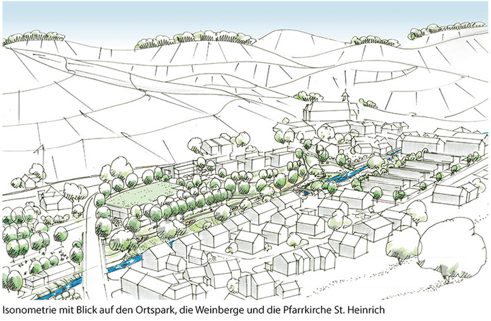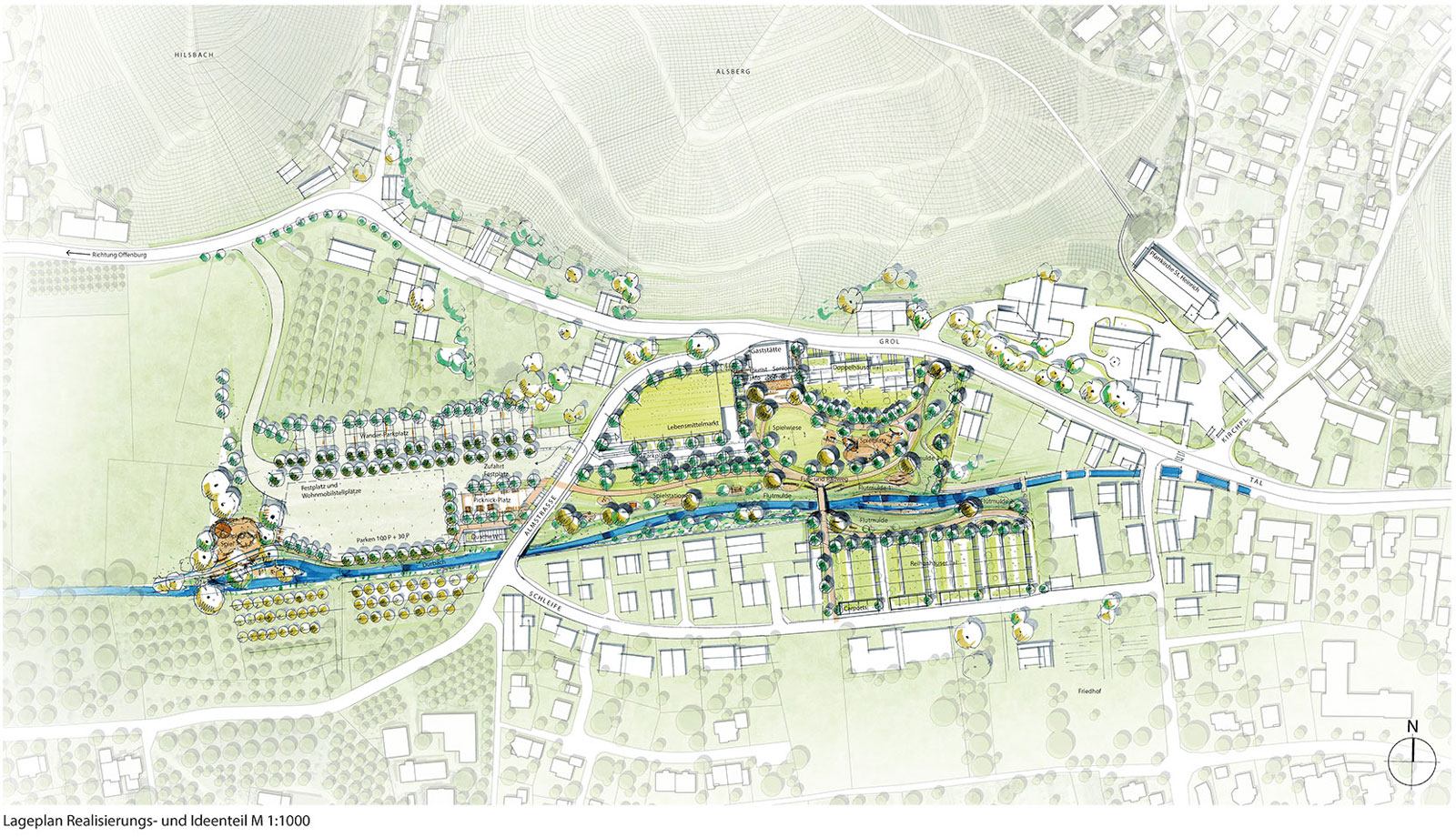 Der Entwurf sieht vor den Lebensmittelmarkt östlich der Almstraße zu verorten. Der eingeschossige Markt wird so weit wie möglich nach Norden in den Hang geschoben und schmiegt sich in seiner äußeren Form an die aufsteigende Almstraße. Das Dach wird als begrüntes Retentionsdach ausgebildet, um einerseits den Wasserabfluss zu drosseln und andererseits als Element besser in den Park integriert zu werden. Die Anlieferung befindet sich auf der östlichen Seite des Lebensmittelmarktes, 30 Stellplätze werden südlich unter Schatten spendenden Baumreihen angeordnet. Östlich des ehemaligen Vereinsheims entstehen drei Doppelhaushälften entlang der Straße Grol, von der sie auch erschlossen werden. Der Höhenversprung zwischen Straße und ehemaligem Sportgelände wird geschickt in der Bauweise übernommen, wodurch die Häuser bergseits und talseits jeweils zweigeschossig ausgebildet werden können – die Staffelgeschoß-Bauweise unterstützt dies. Das Baugebiet südlich des Durbachs wird als Reihenhaussiedlung als Antwort auf den Bedarf der Gemeinde nach bezahlbarem Wohnraum und auf die Bauweise des neuen Seniorenheims bebaut. Die Erschließung erfolgt von der Straße Schleife. Auch hier wird die Bauweise mit Staffelgeschossen favorisiert und zusätzlich sollen Gründächer zum Regenwassermanagement beitragen. Das ehemalige Vereinsheim soll auf Wunsch der Bevölkerung im OG die gastronomische Funktion beibehalten, während im zum Park hin gelegenen unteren Geschoß eine Touristeninformation und ein Seniorentreff dazukommen. Der Entwurf sieht einen terrassenähnlichen Vorplatz vor, der zur Begegnung und zum Verweilen für Jung und Alt einlädt.